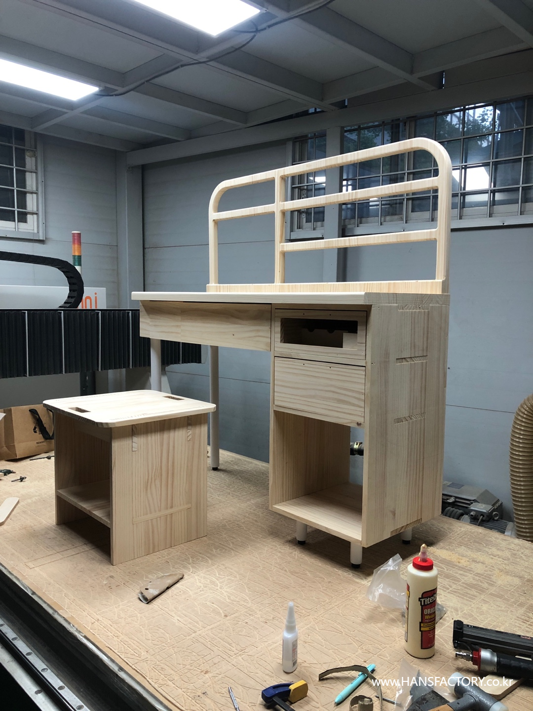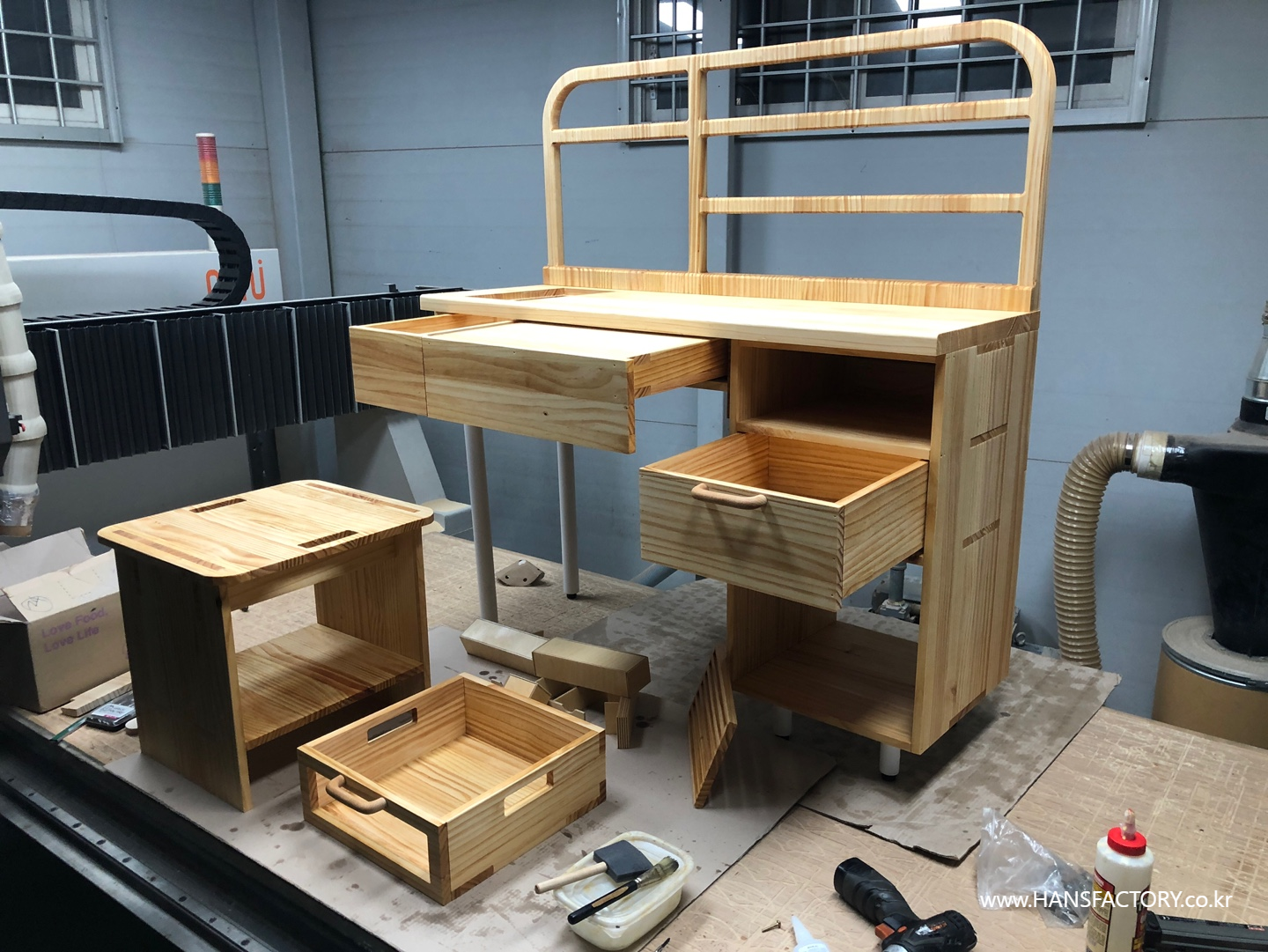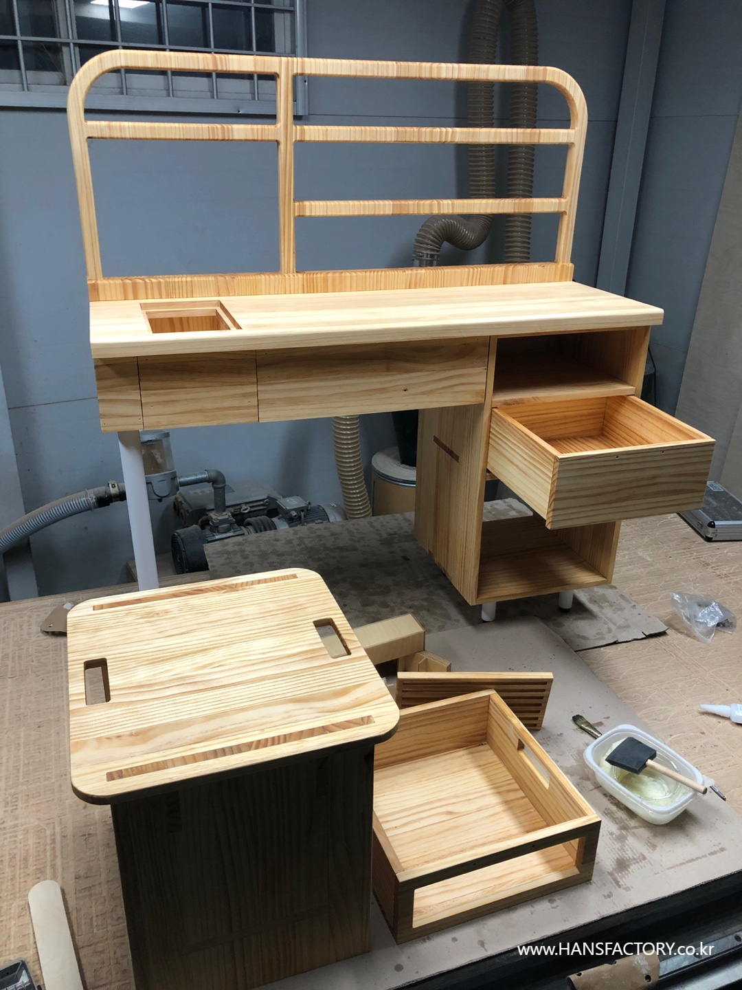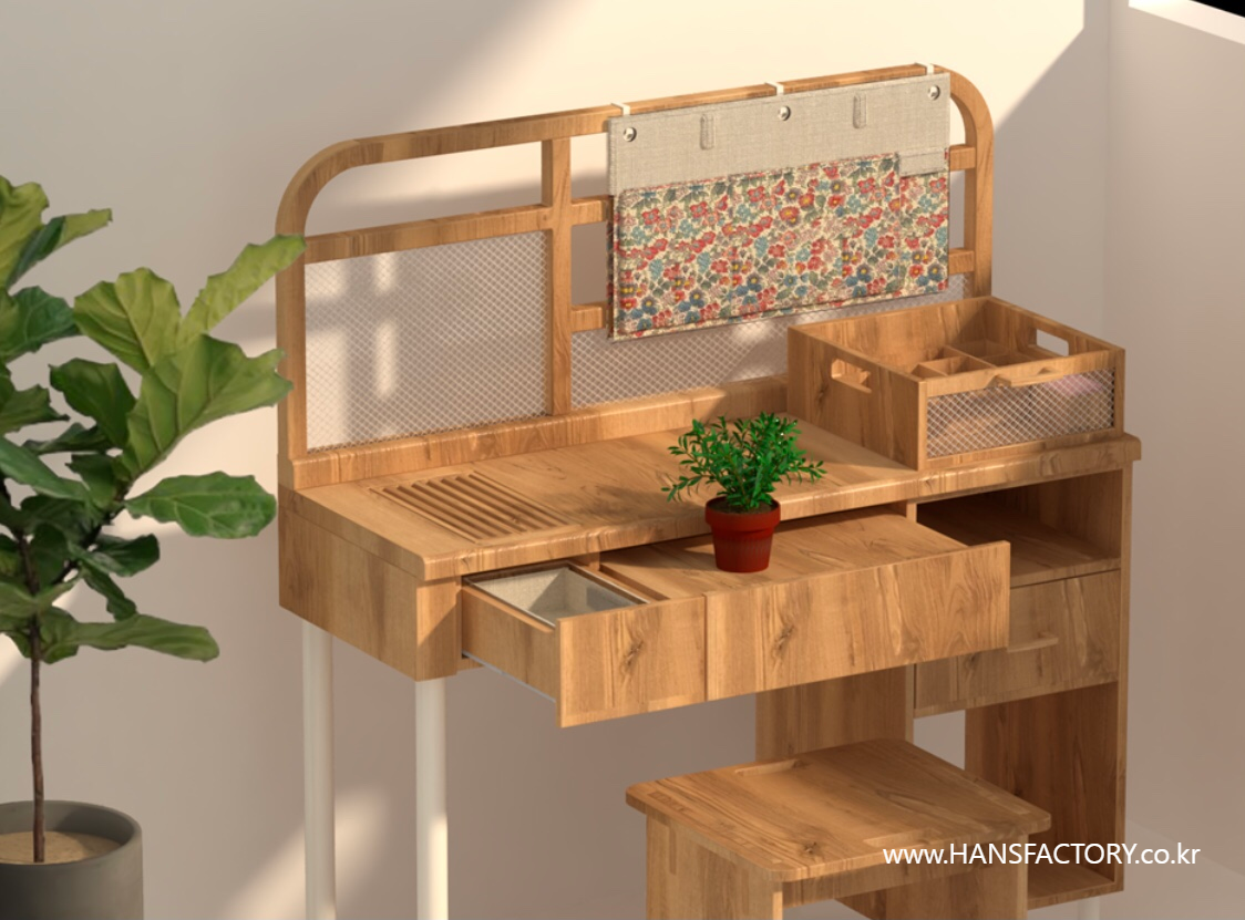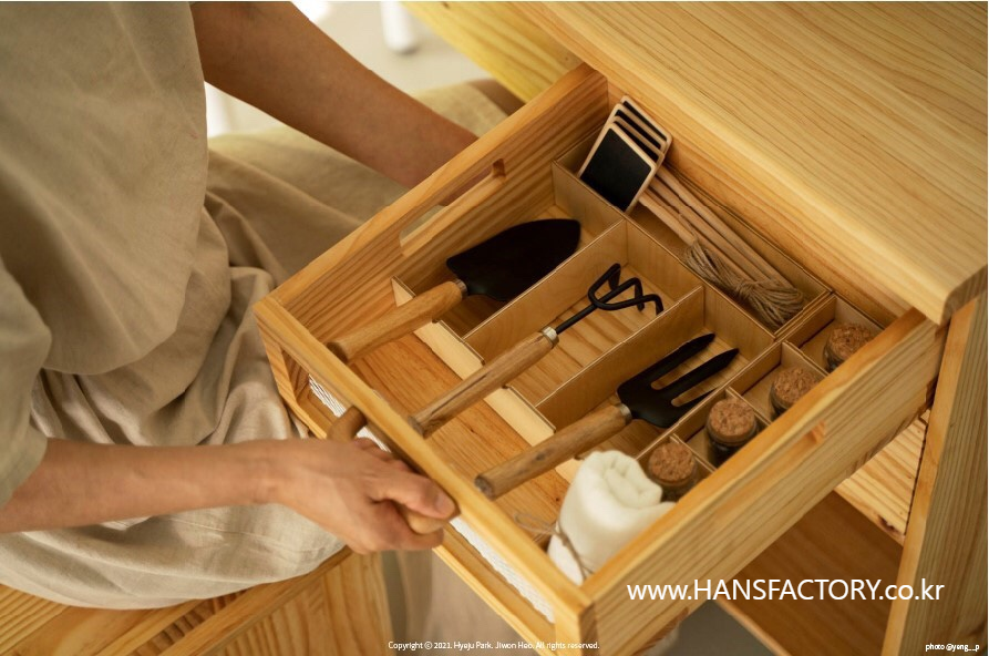 상판과 서랍의 조립, 하단부와 금속 부품의 결합이 설계한 대로 차근차근 결합되고 있고요