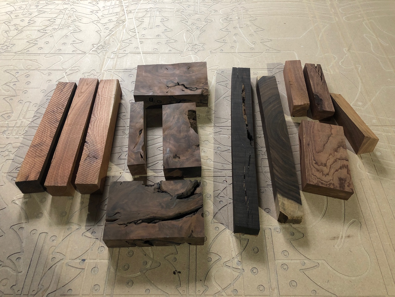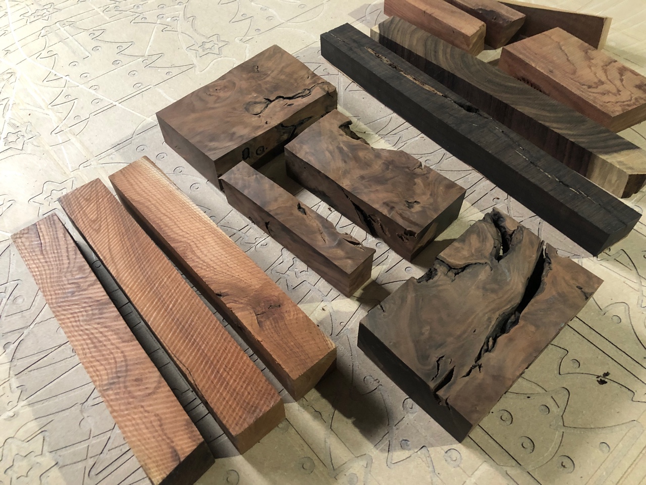 벽조목, 멀바우, 벽괴목, 부빙가, 느티 고사목, 장미목, 흑단, 먹감나무, 참죽 등등