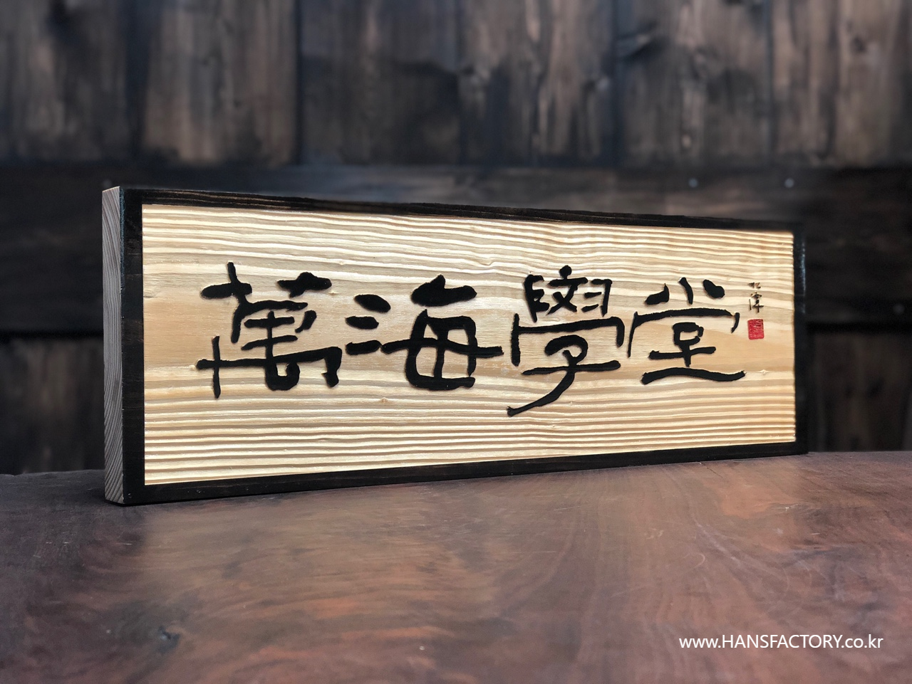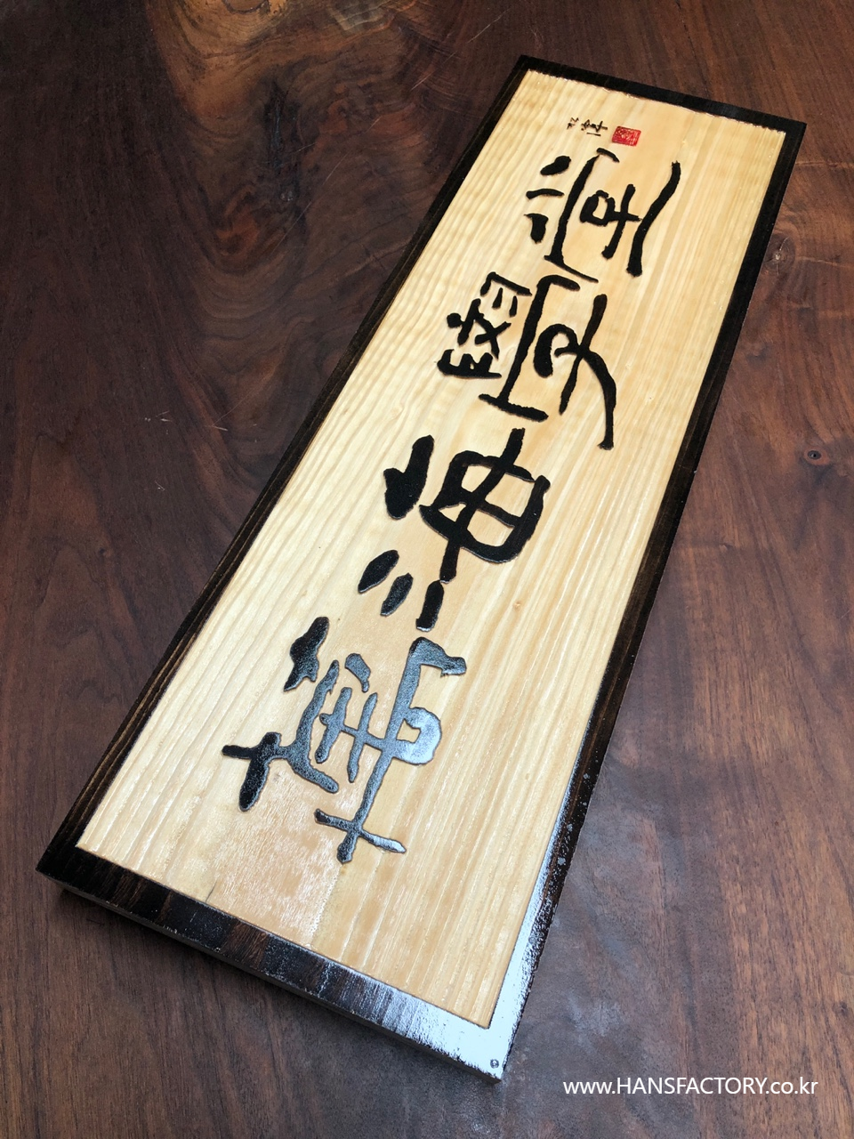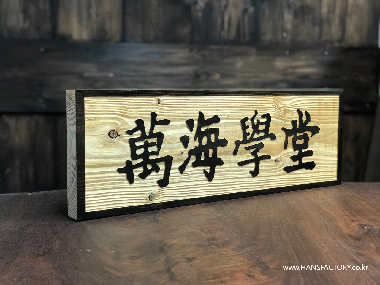 가로 600mm x 세로 200mm 크기의 원목 현판 제작