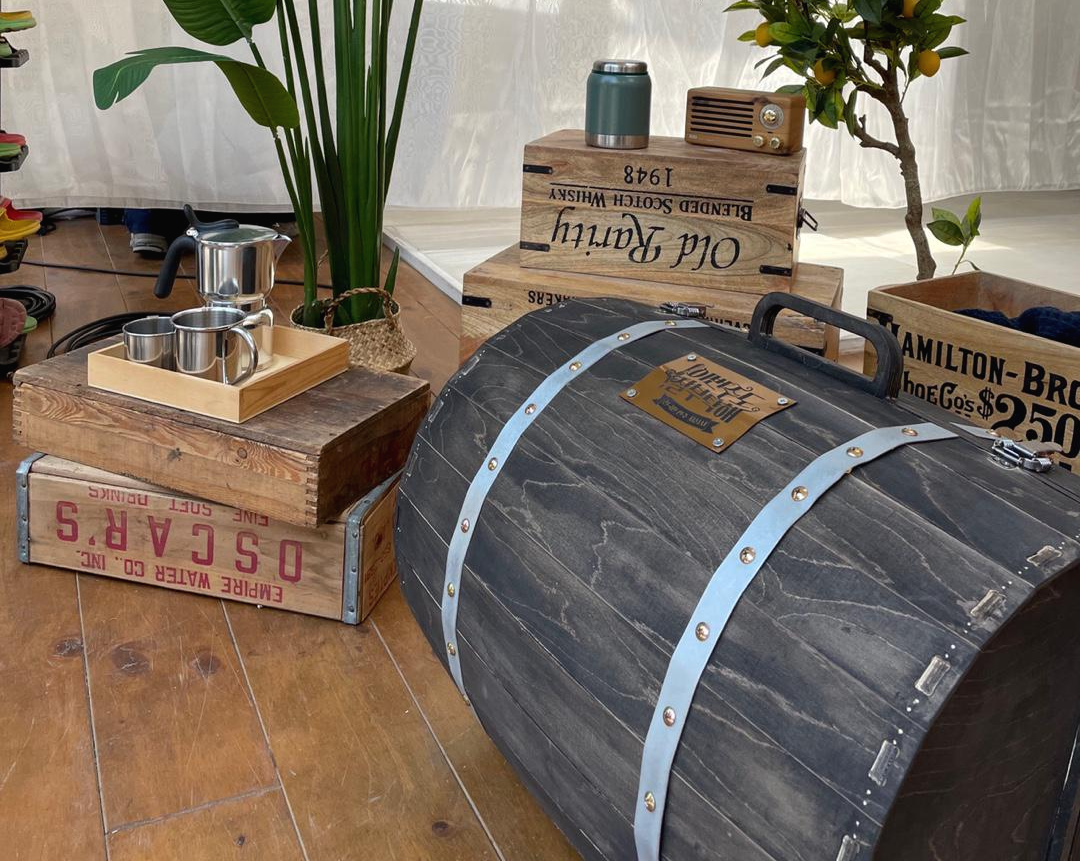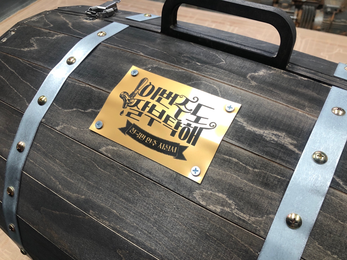오크통 술잔 케이스에 " 이번주도 잘 부탁해 "