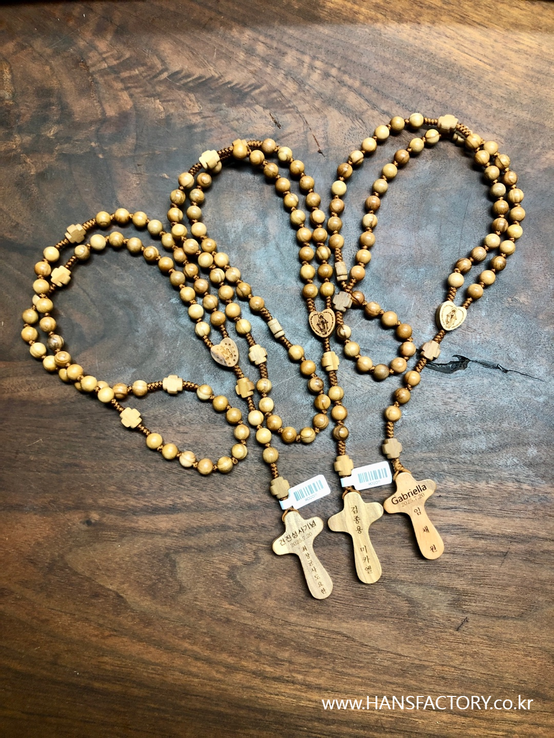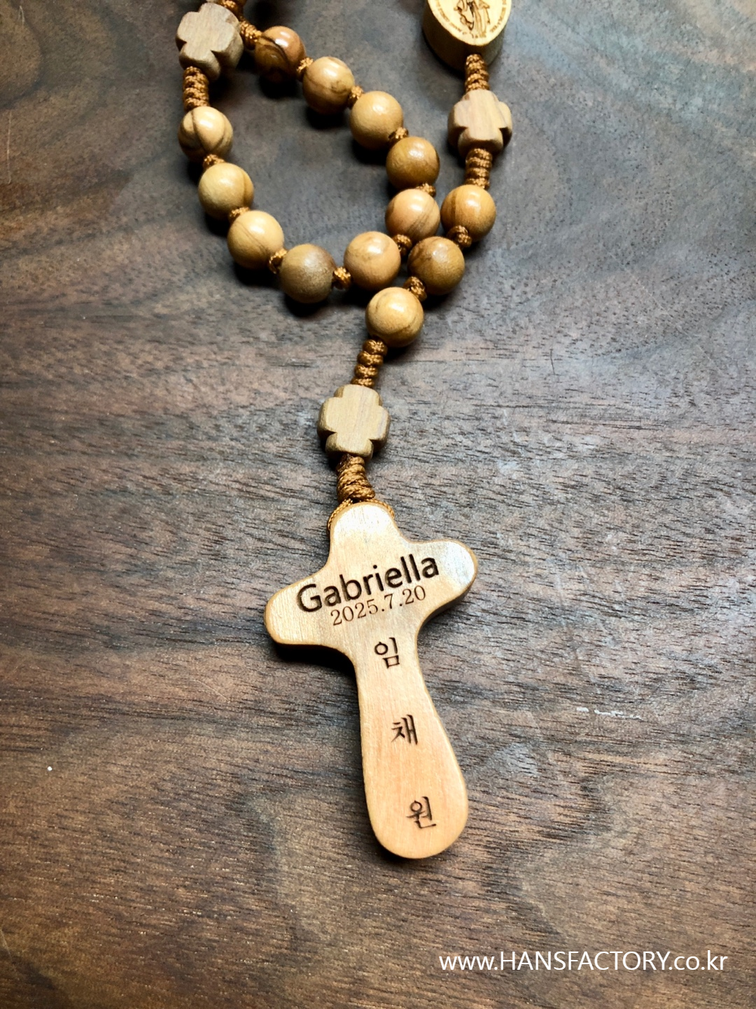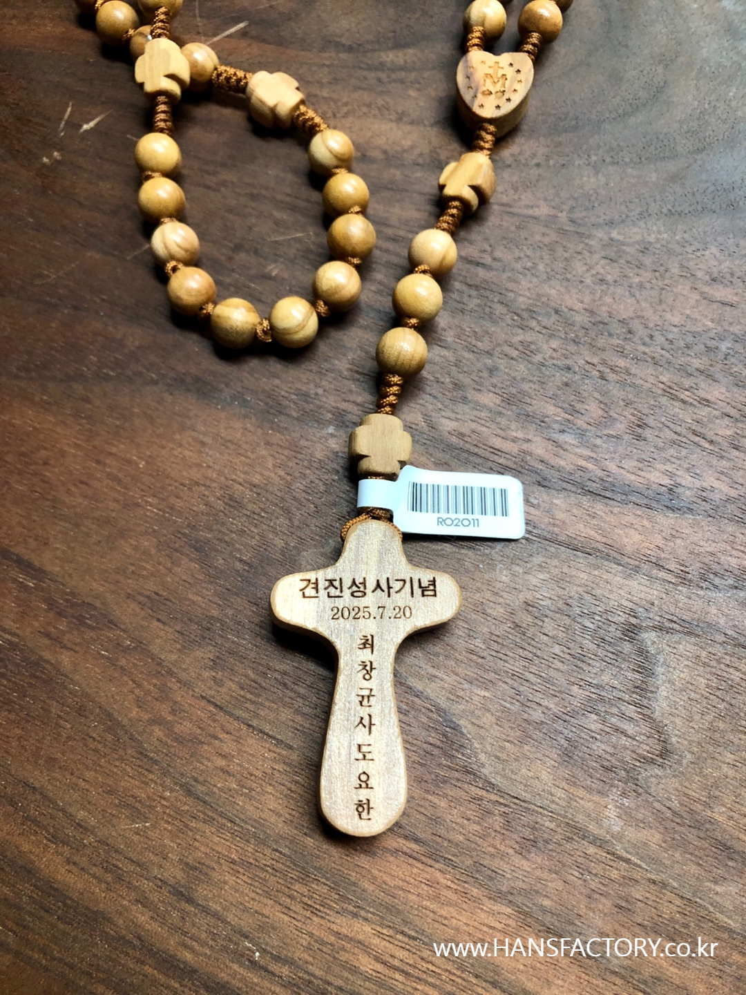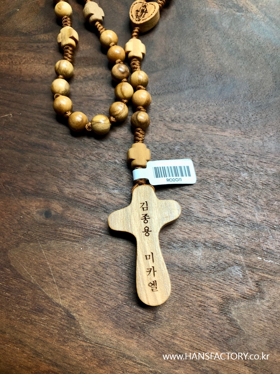 작은 글자들을 묵주 십자가 뒷면에 조각합니다.