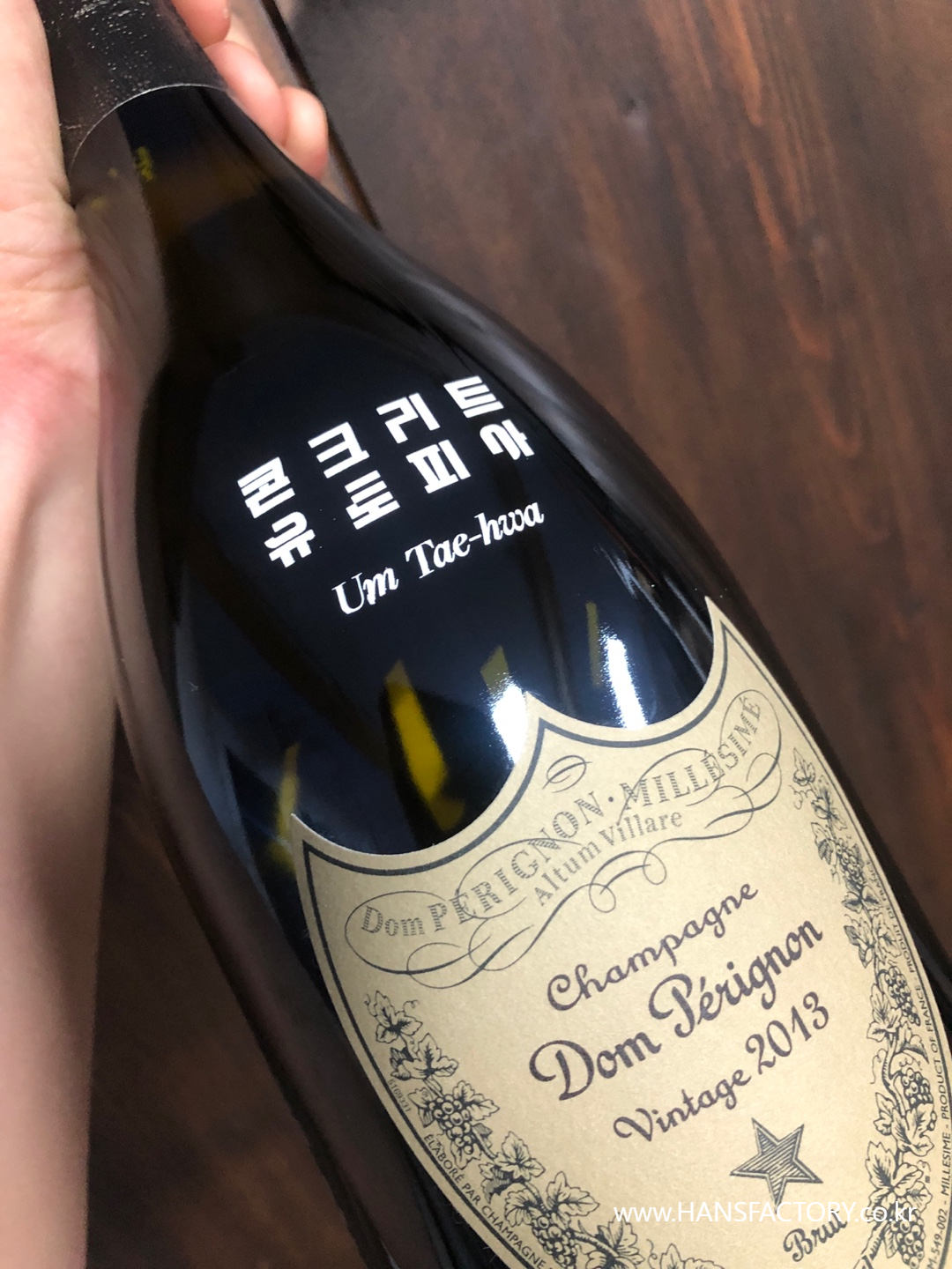 돔페리뇽 샴페인에 커스텀 로고를 새겨드리는 작업