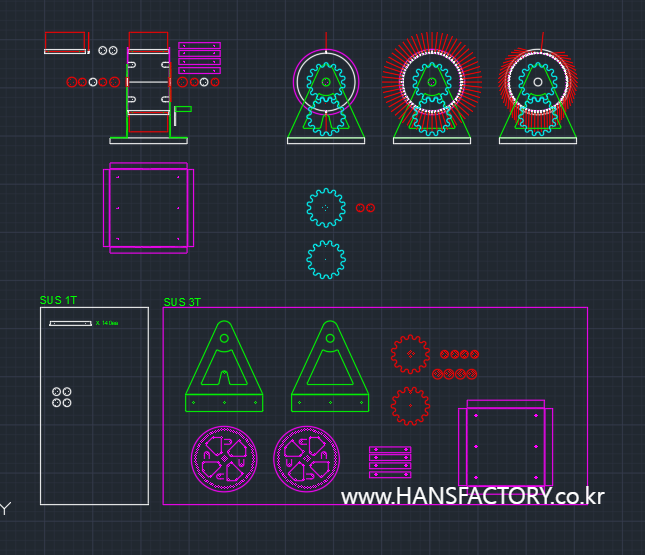 스테인리스 0.8T, 1T, 3T 자재를 가공해서 각 파츠별 부품을 준비했고요