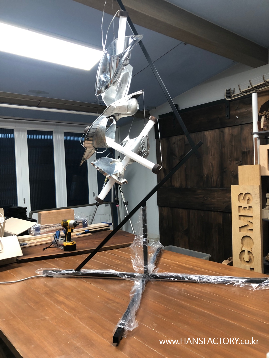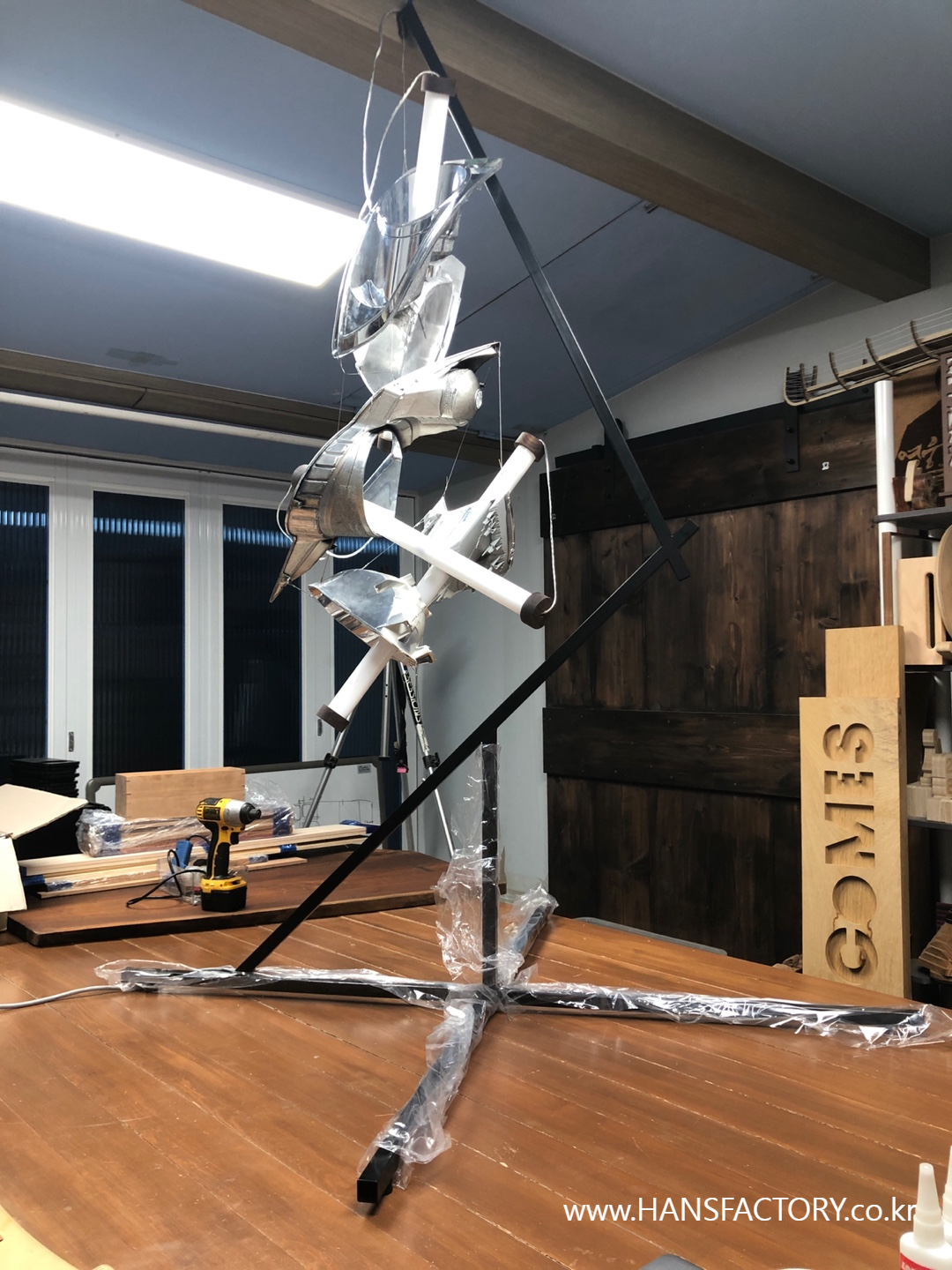 금속으로 거치대를 구성하고 자동차 후미등 부품들을 배치하고