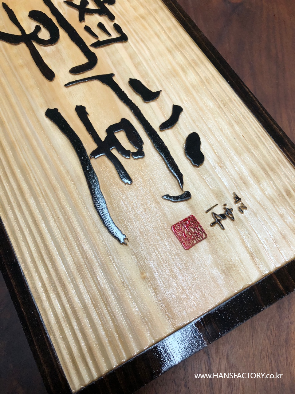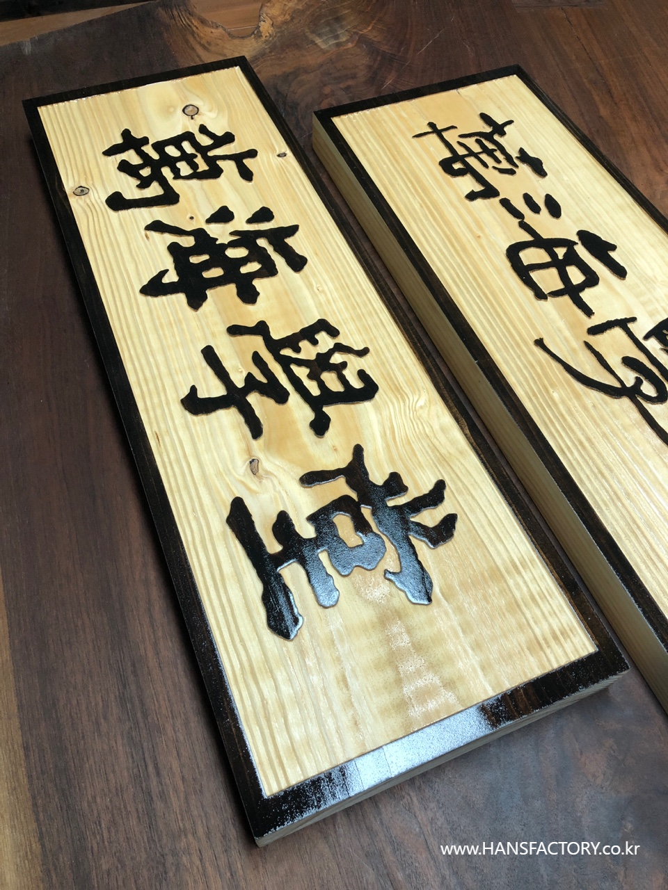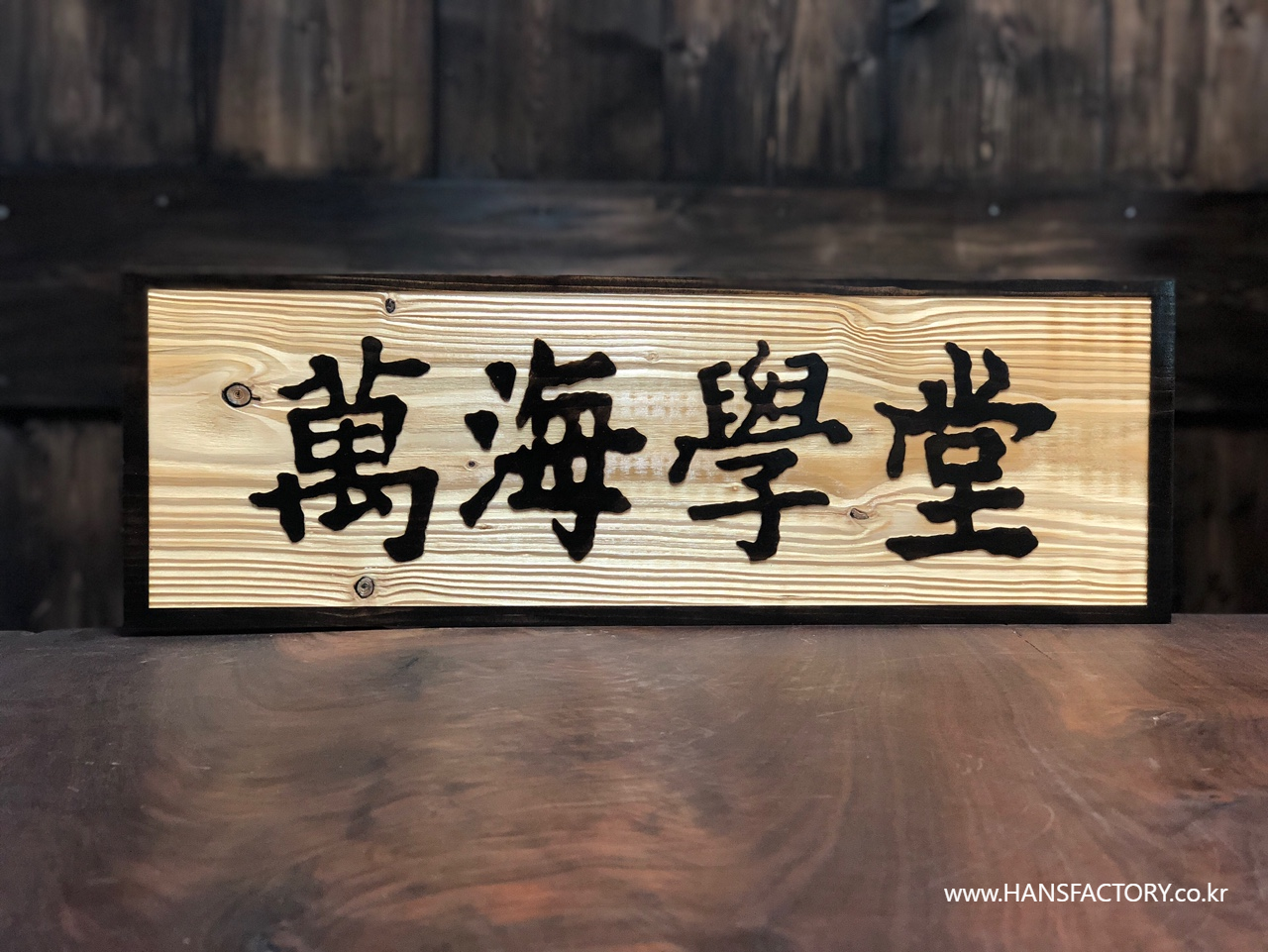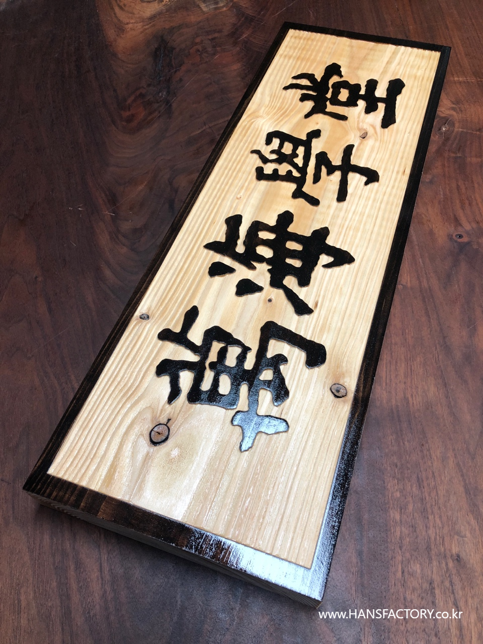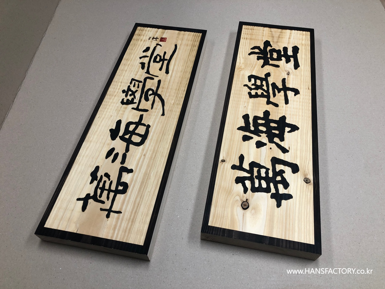 가로 600mm x 세로 200mm 크기의 원목 현판 제작