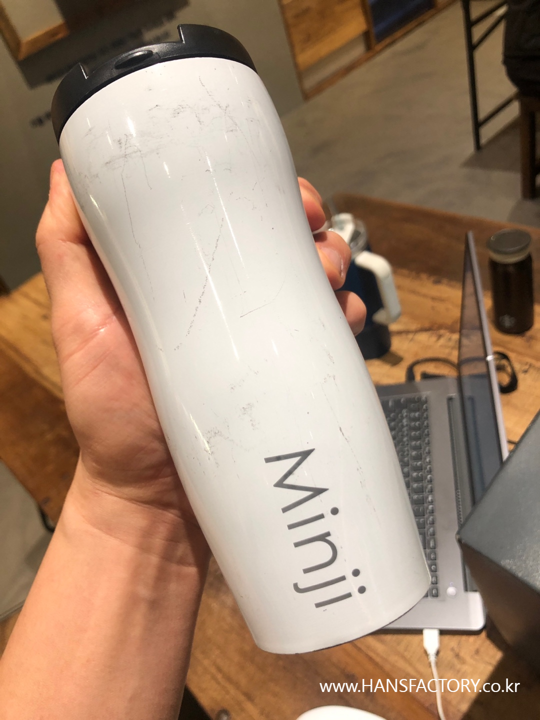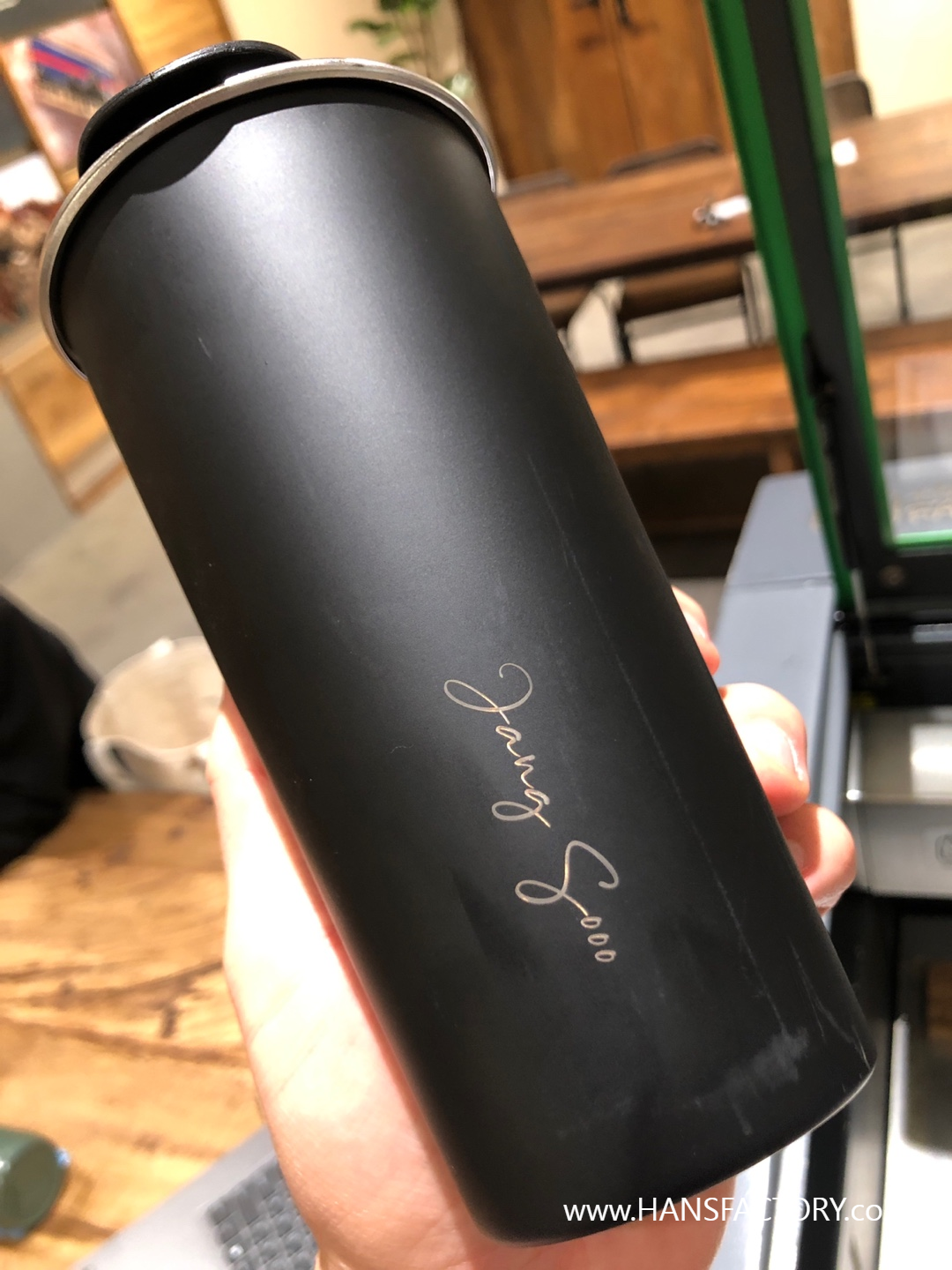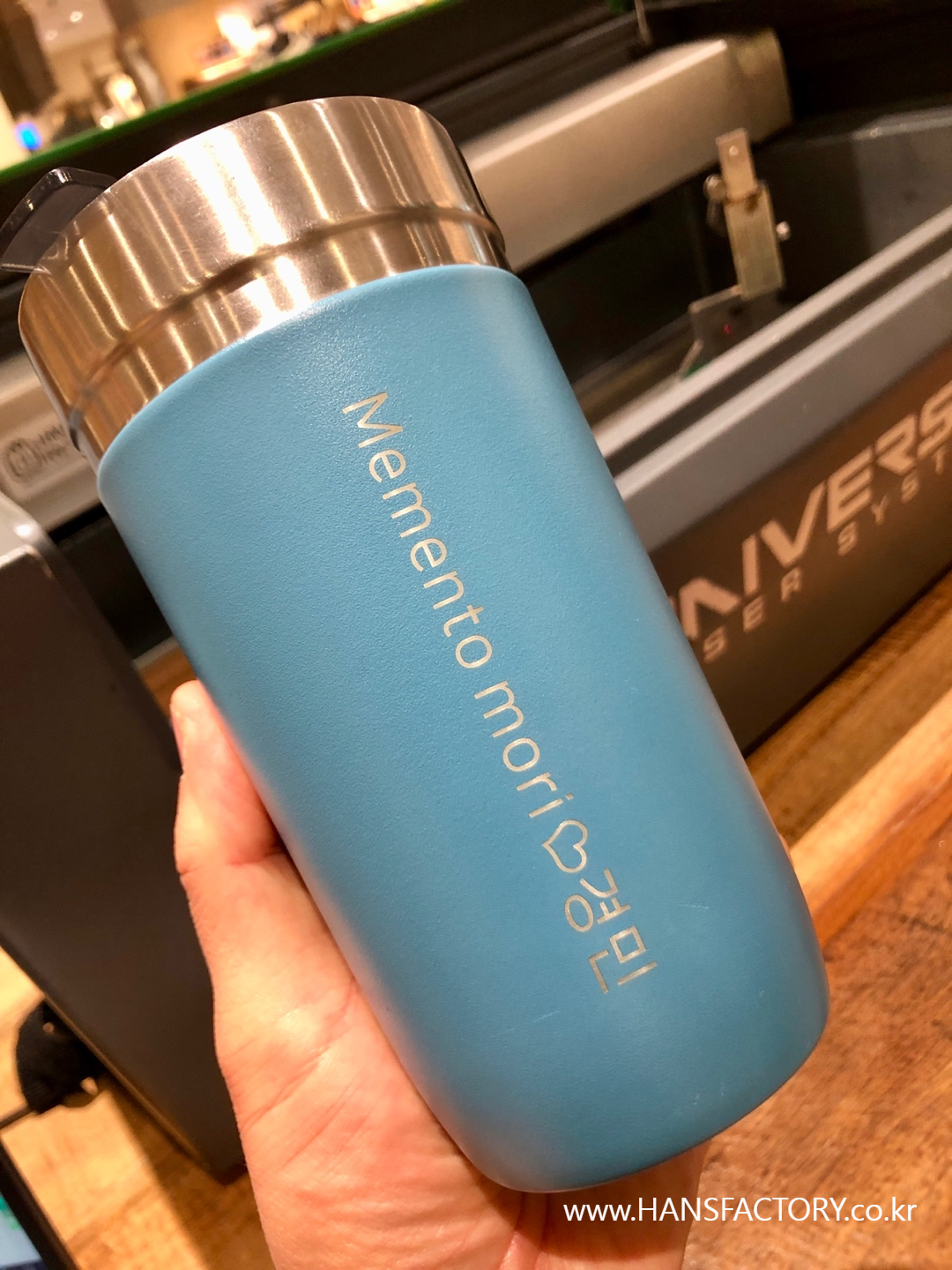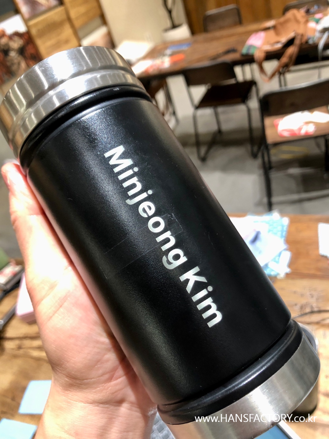 갖고 오신 텀블러에 원하는 이름이나 문구, 로고를 새겨 드렸습니다.