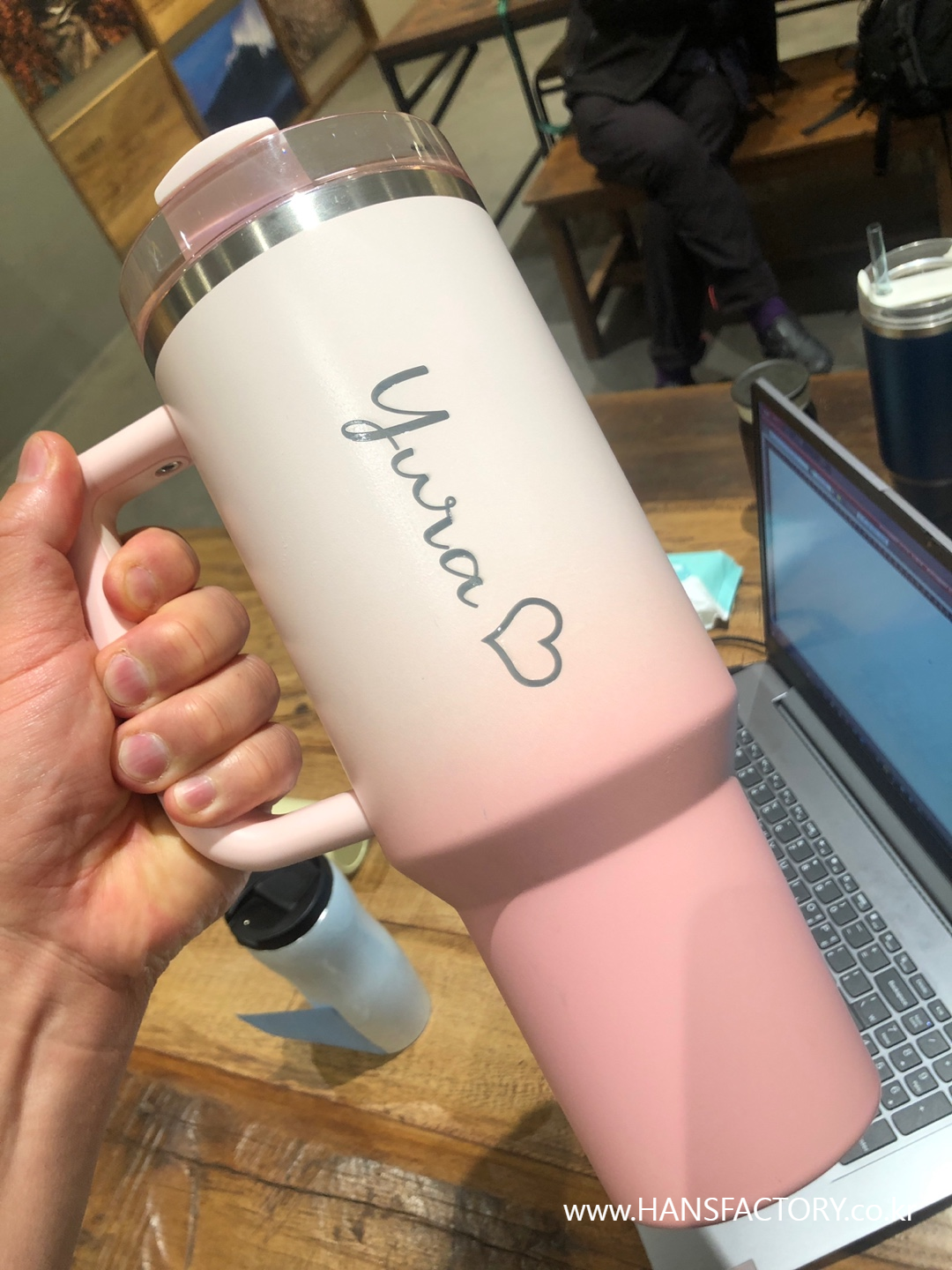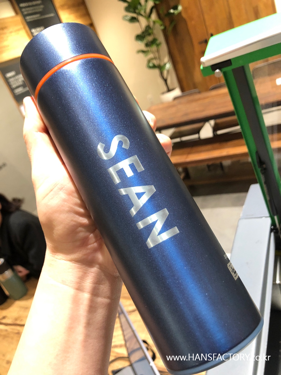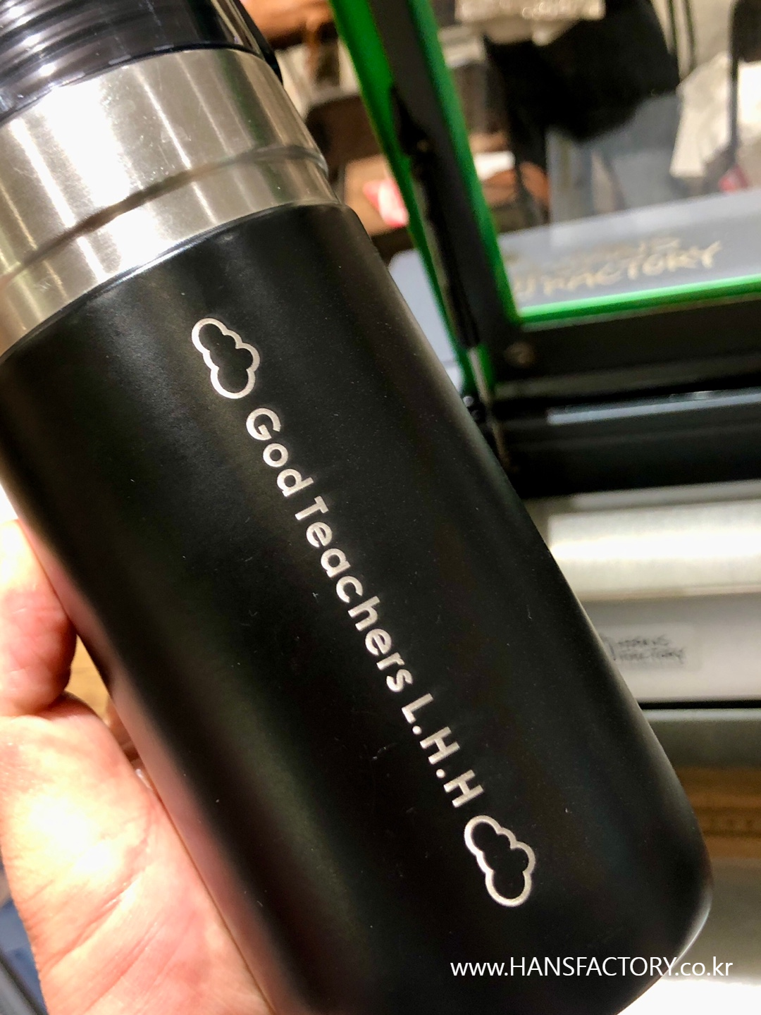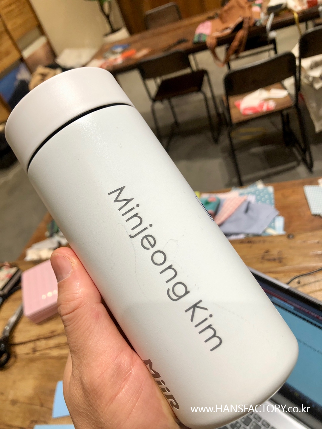 갖고 오신 텀블러에 원하는 이름이나 문구, 로고를 새겨 드렸습니다.