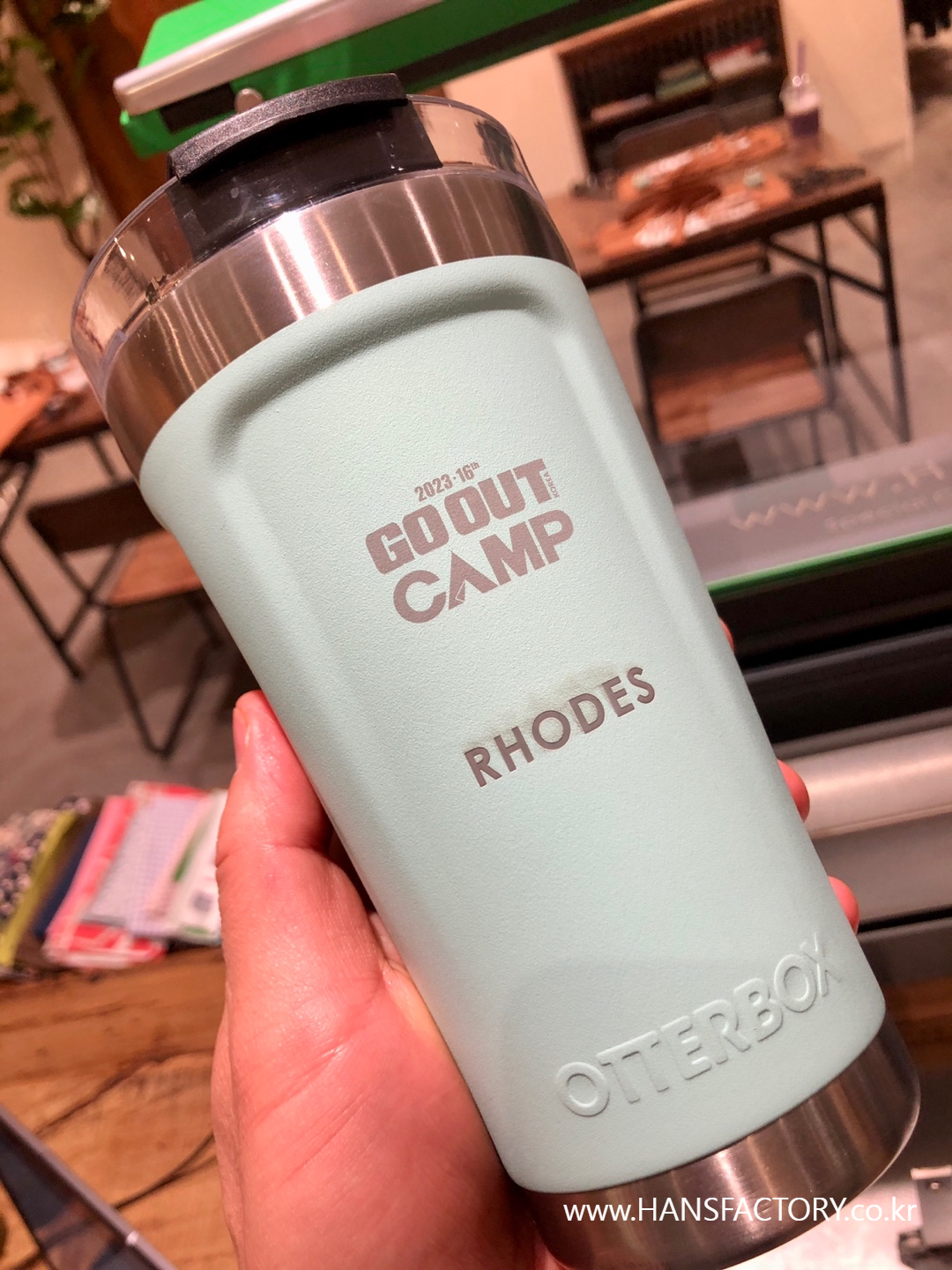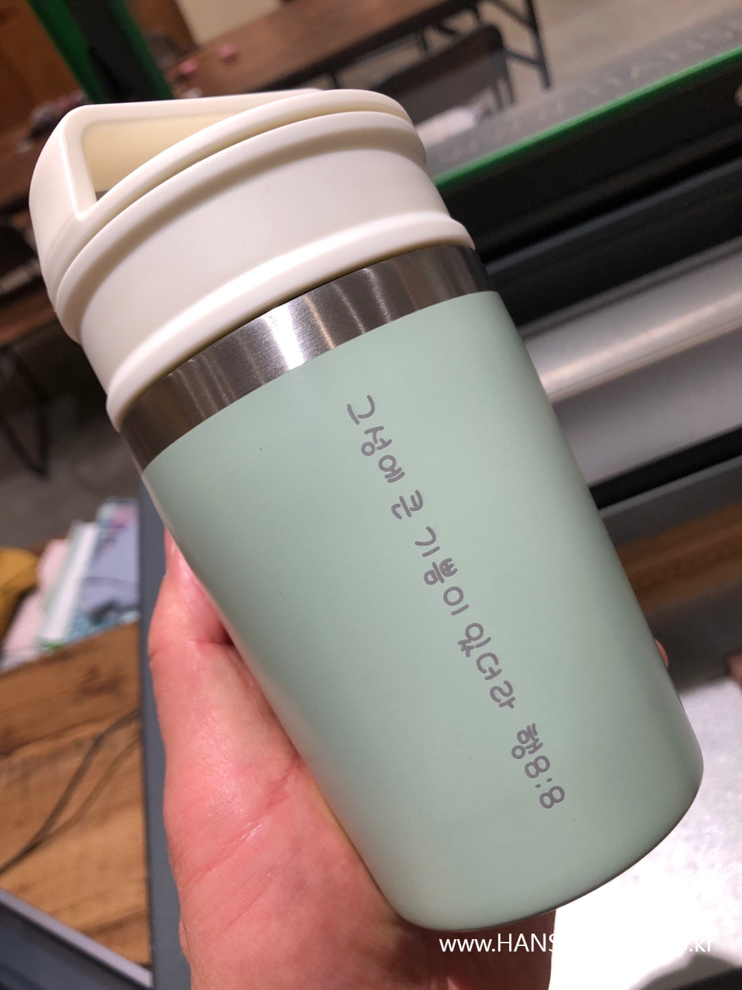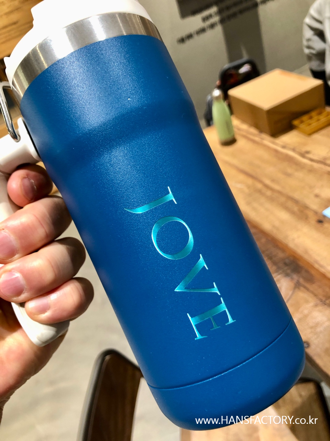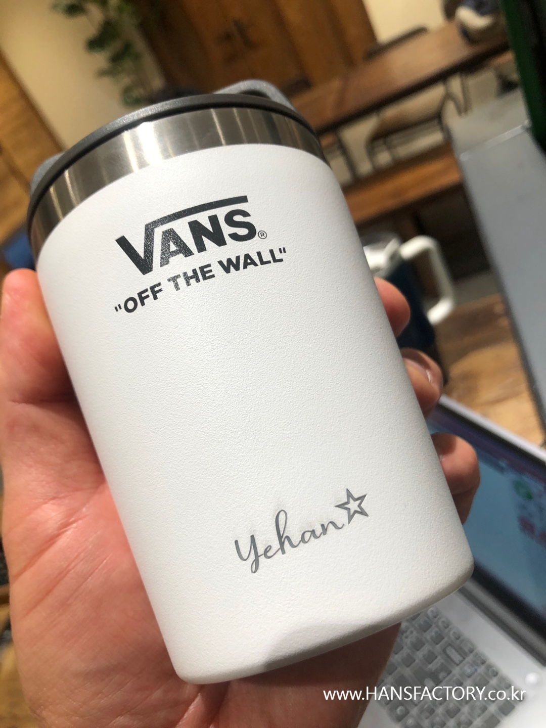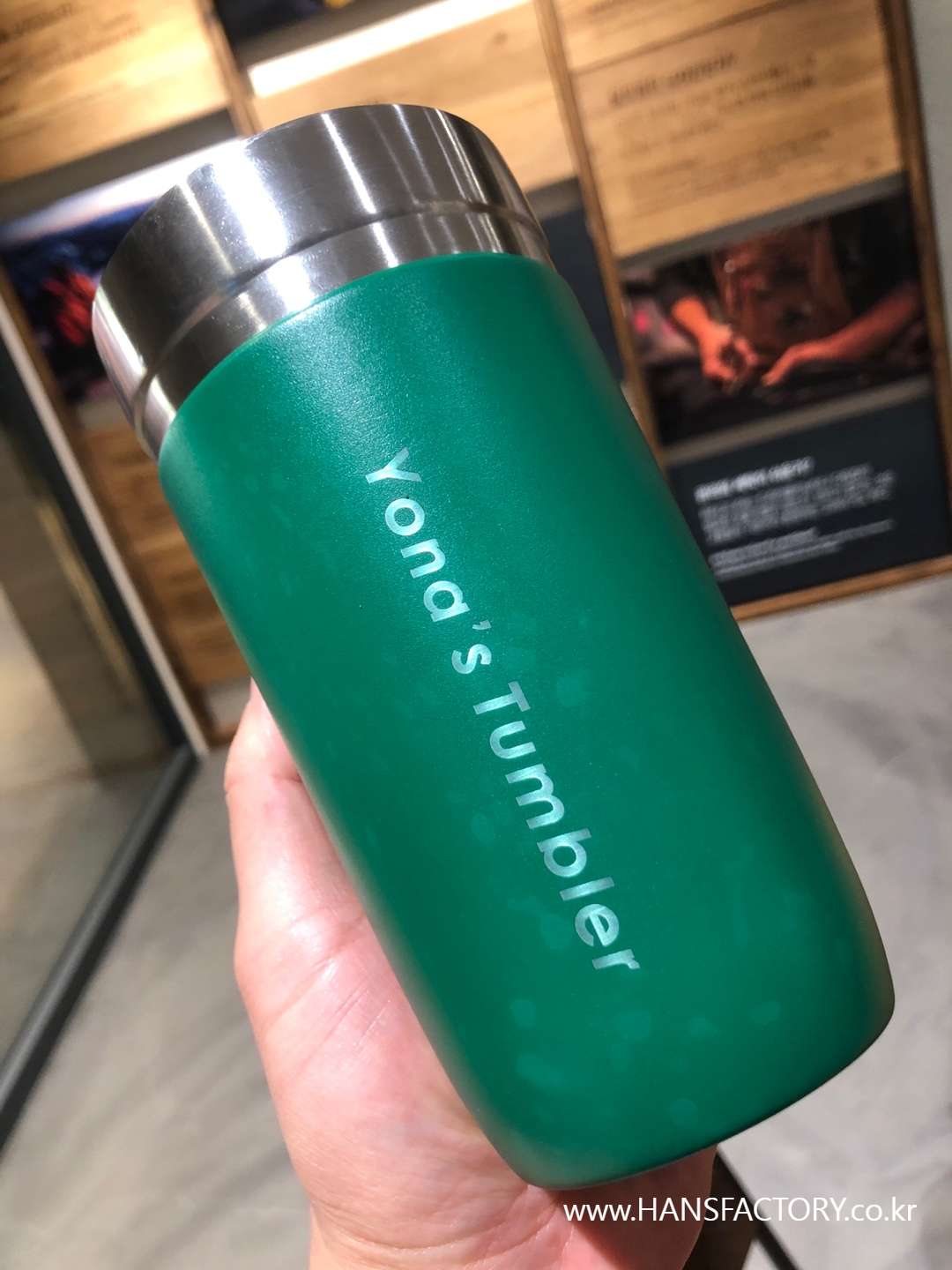 갖고 오신 텀블러에 원하는 이름이나 문구, 로고를 새겨 드렸습니다.