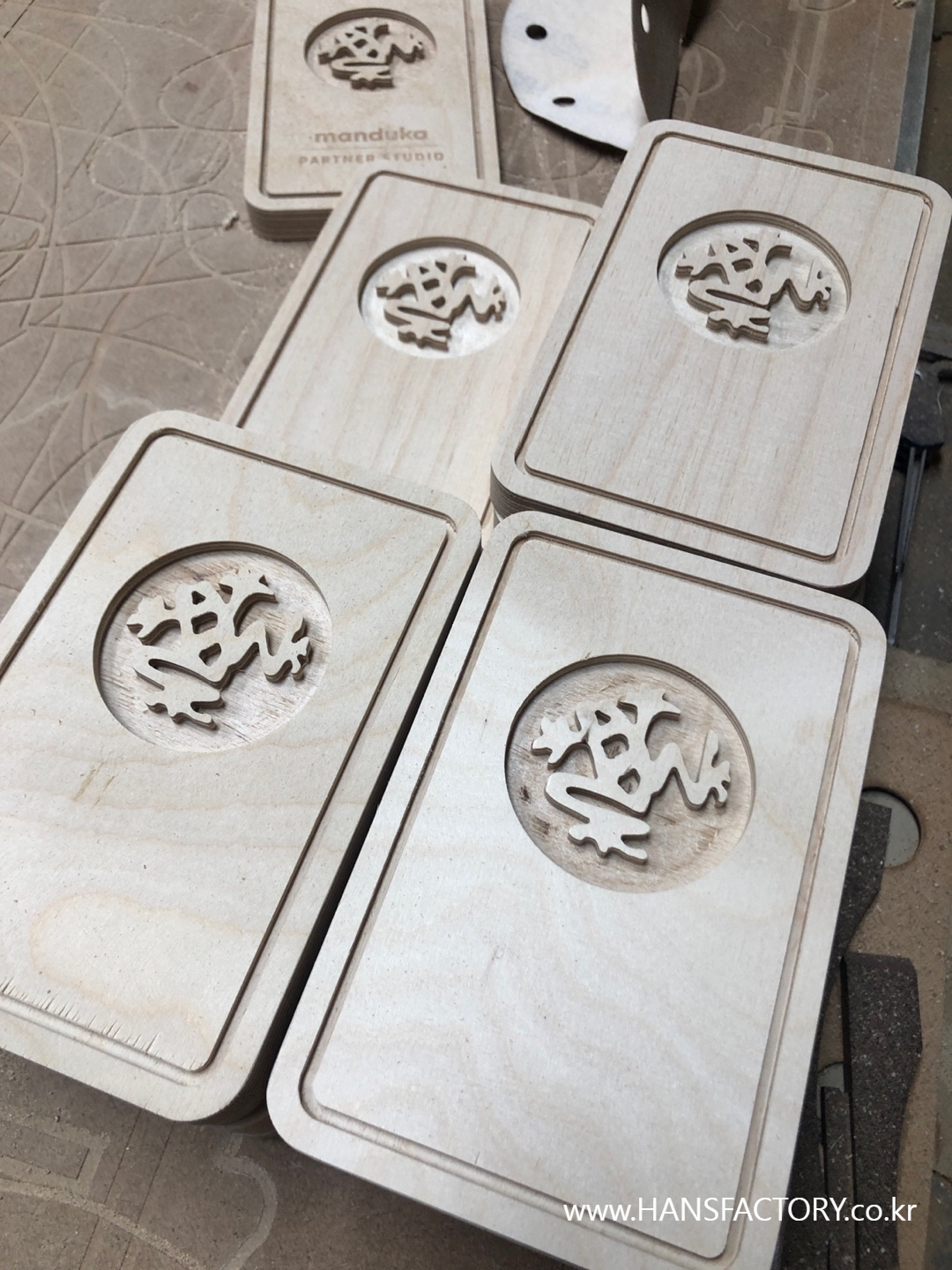 자작나무를 가공해서 만두카 로고를 음각으로 파내고