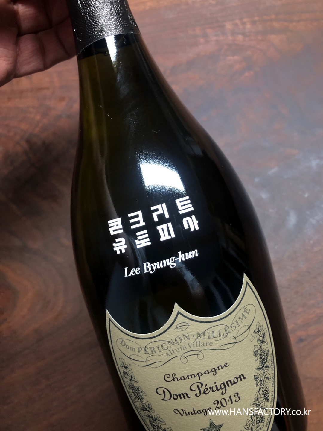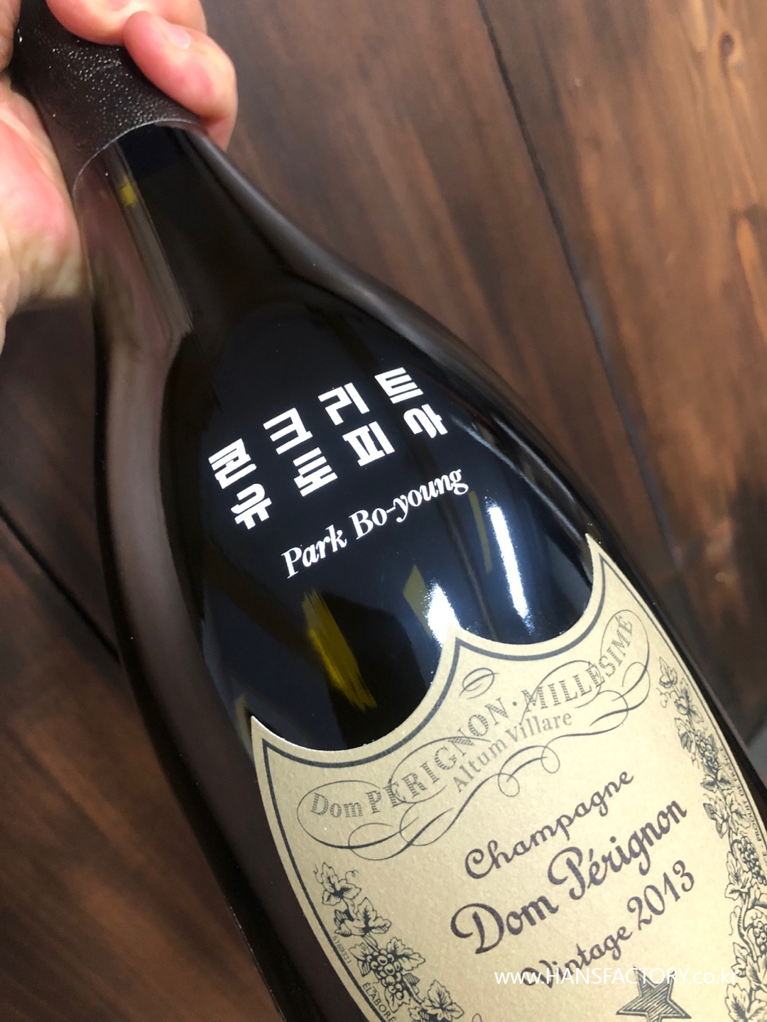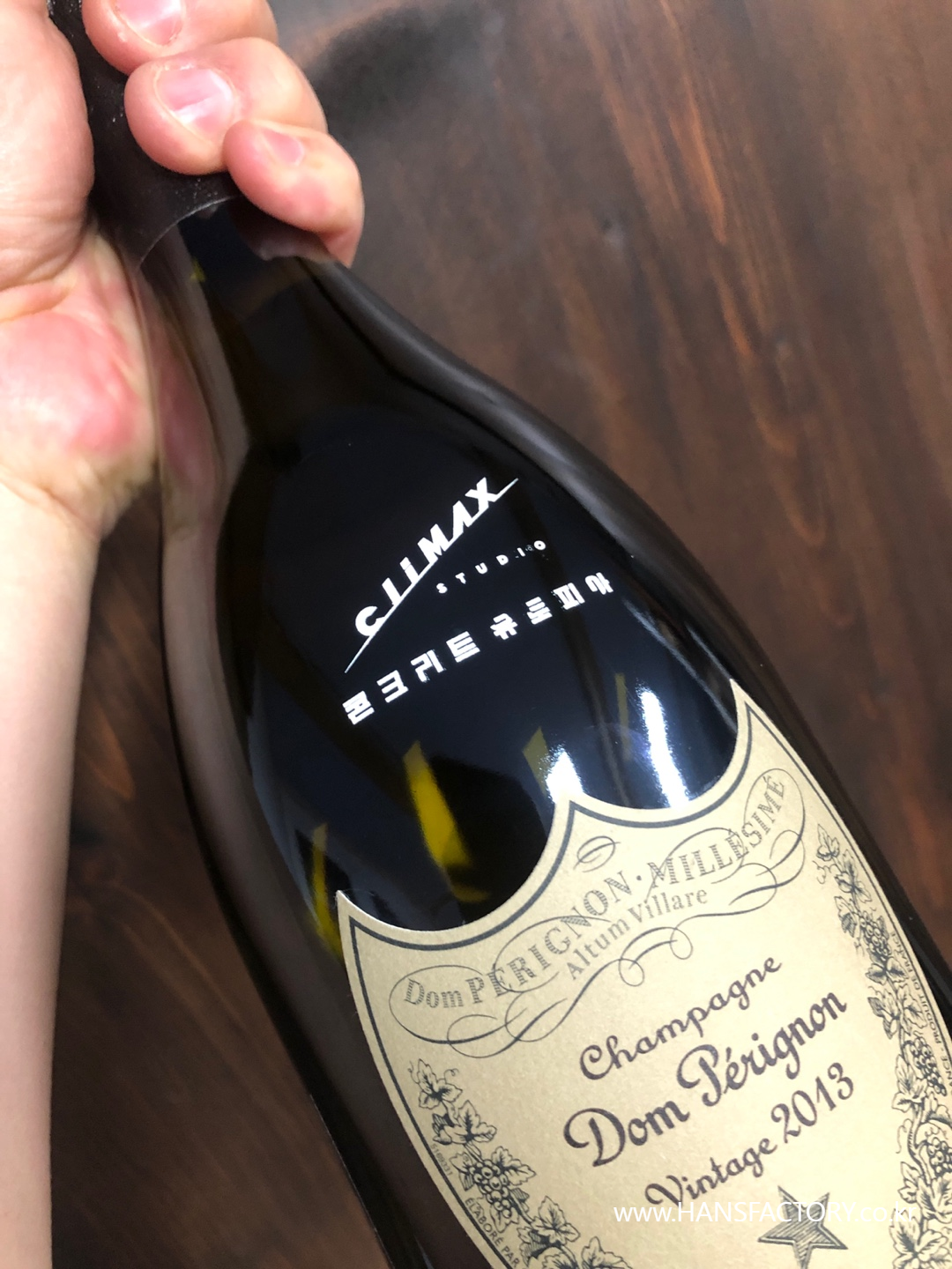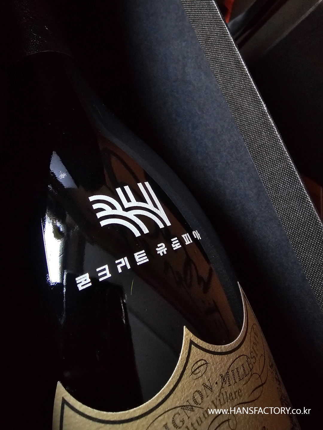 돔페리뇽 샴페인에 커스텀 로고를 새겨드리는 작업