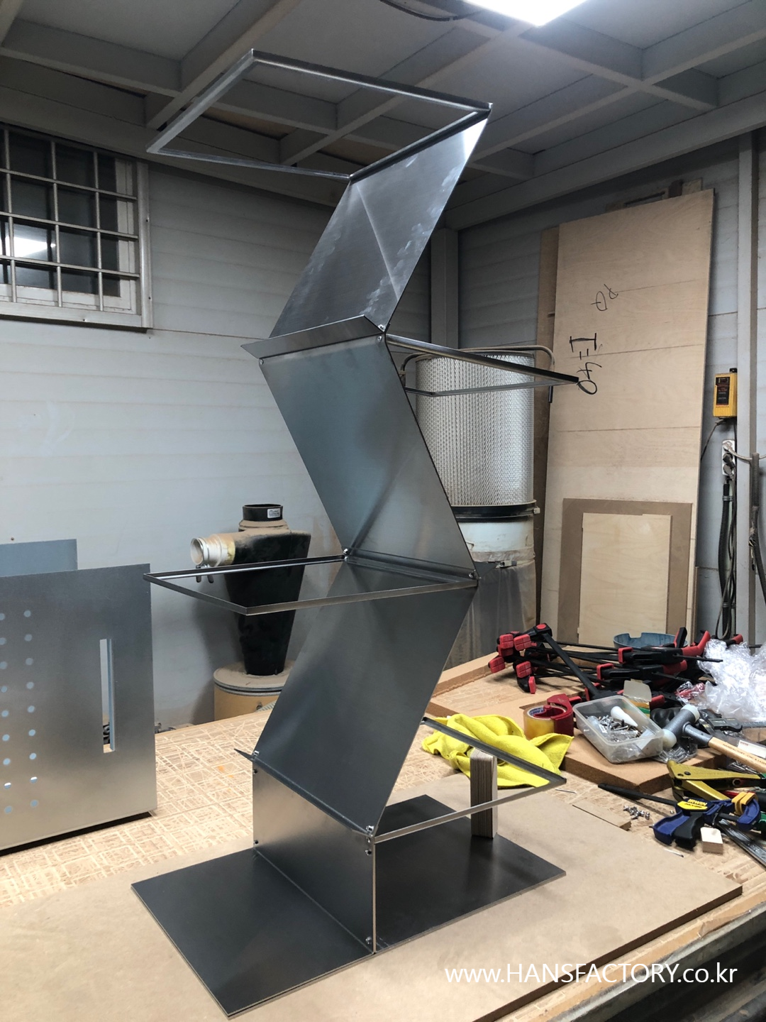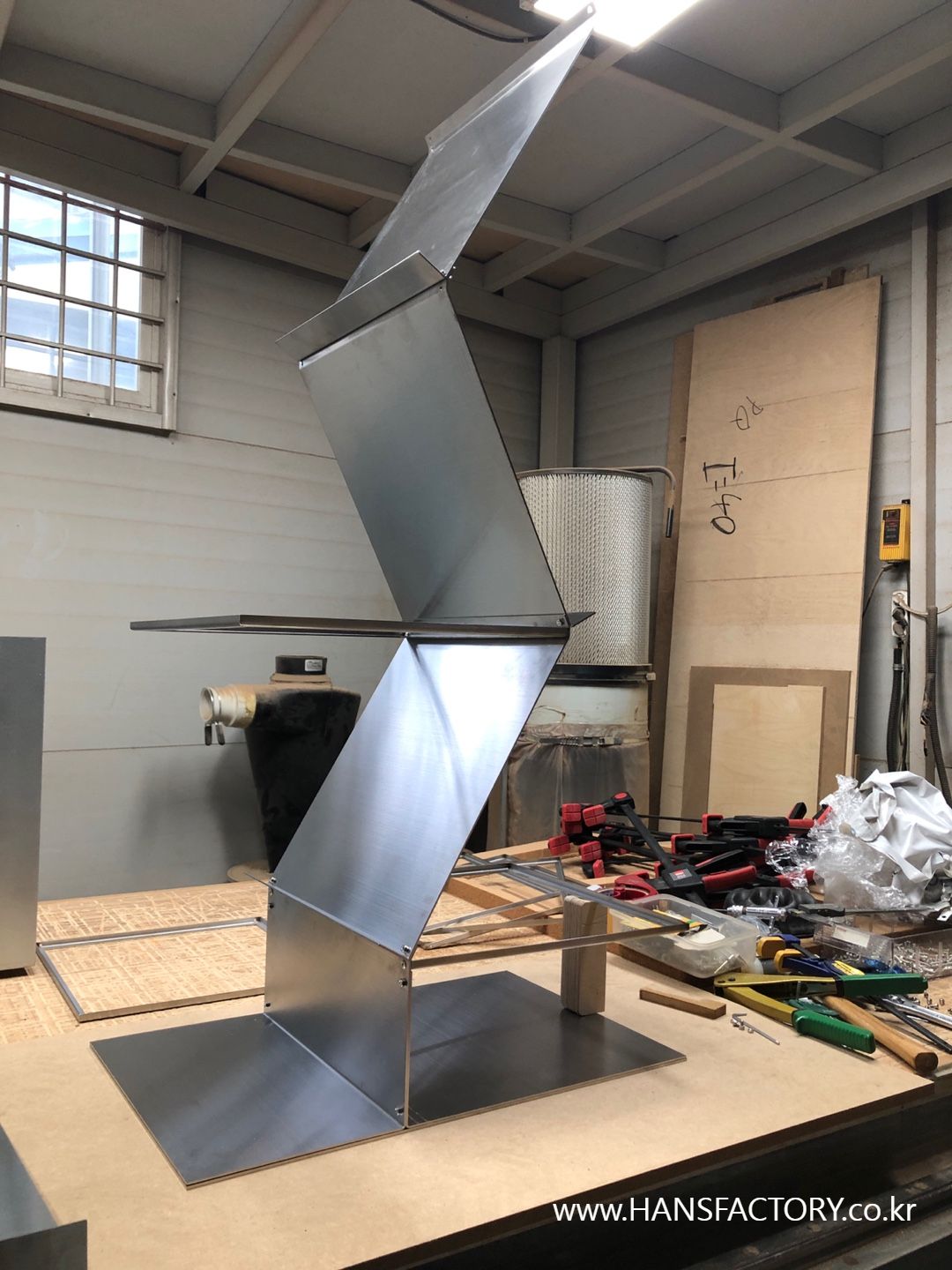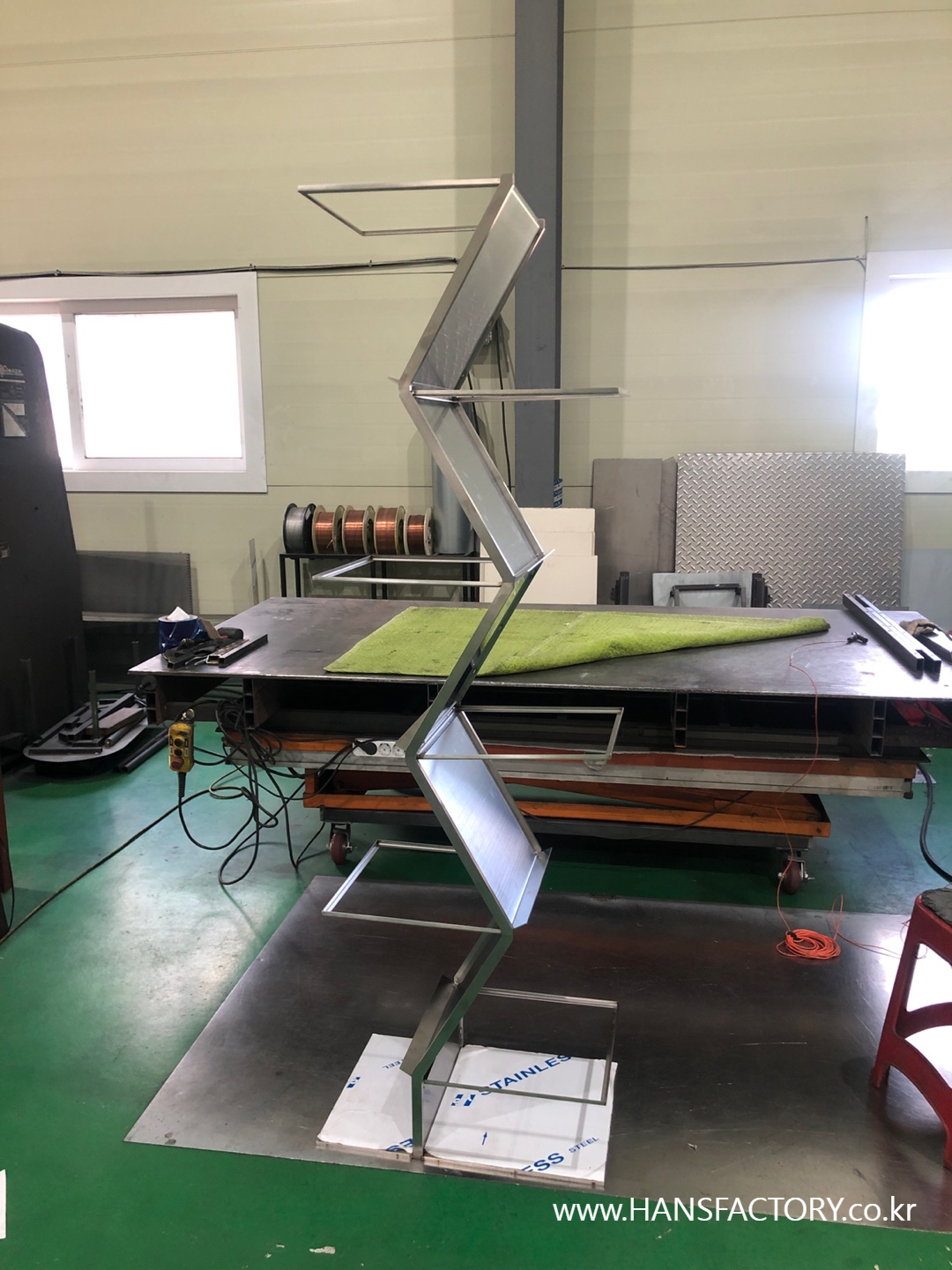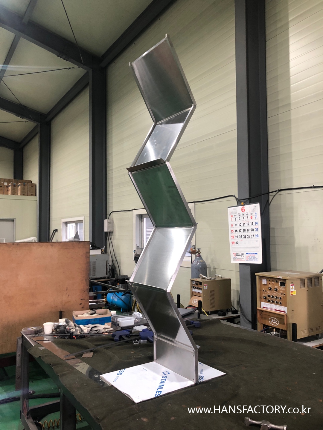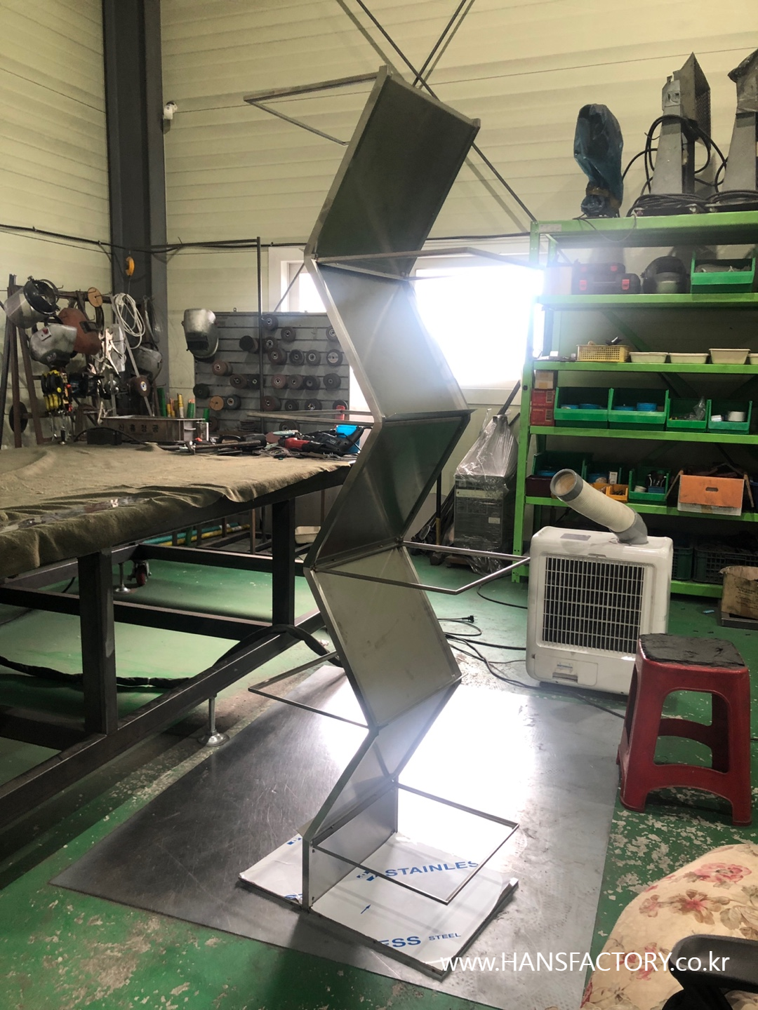 이번 작품은 스테인리스 스틸과 아크릴이 주된 재료이고요, 용접을 최소화하려고 노력을 했는데